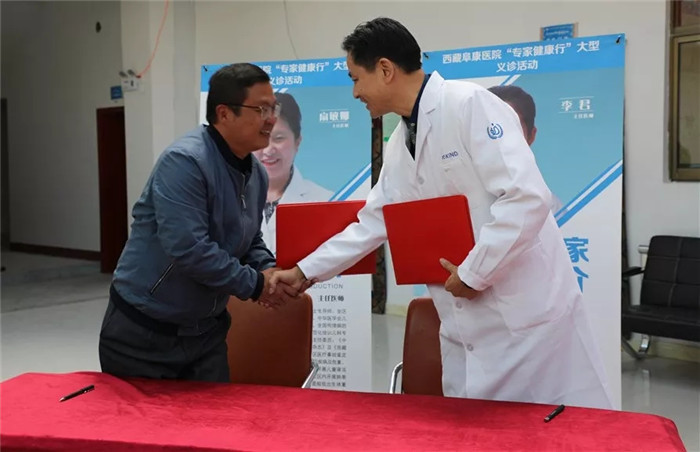 西藏阜康醫院總院長寧曉、夏瑪鄉鄉長李智安分別代表西藏阜康醫院和夏瑪鄉衛生院在醫聯體合作協議上簽字,并共同為"夏瑪鄉衛生院 · 西藏阜康醫院醫療聯合體”揭牌。李智安鄉長在致辭中表示,西藏阜康醫院是一家專家眾多、服務到位,貼近廣大人民群眾的醫院,長期以來以精湛的醫療技術、優良的服務質量和優美的醫療環境受到社會各界的廣泛認可和贊譽。今天阜康醫院和夏瑪鄉衛生院舉行醫聯體合作簽約儀式,并為夏瑪鄉群眾開展"專家健康行”義診活動,充分體現了阜康醫院關心廣大基層群眾疾苦、無私奉獻社會的高尚情操,非常感謝阜康醫院為嘉黎縣和夏瑪鄉人民群眾所做的一切。