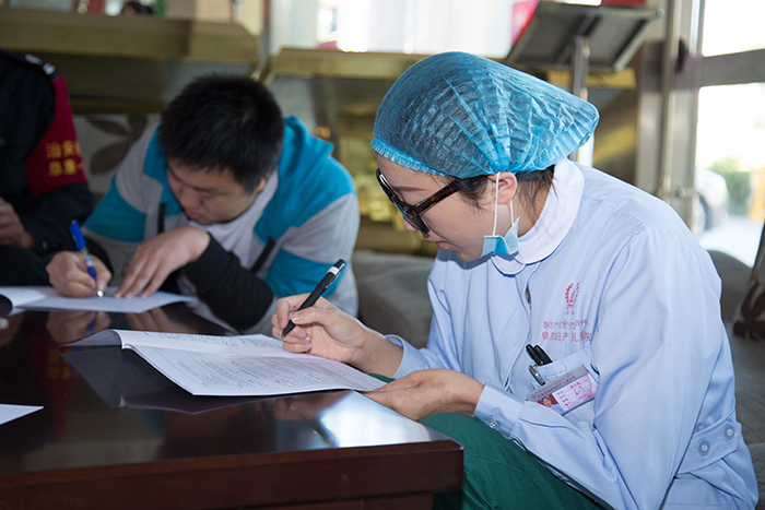 參加(jia)獻血(xue)的醫務人員(yuan)填寫表格