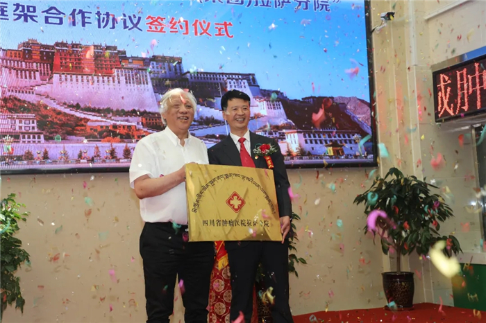 四川省腫瘤醫院黨委書記郎錦義,西藏阜康醫療股份有限公司黨委書記、董事長王斌代表雙方共同簽署《川藏區域共建四川省腫瘤醫院(集團)拉薩分院戰略框架合作協議》,隨后郎錦義書記向王斌董事長進行了授牌。