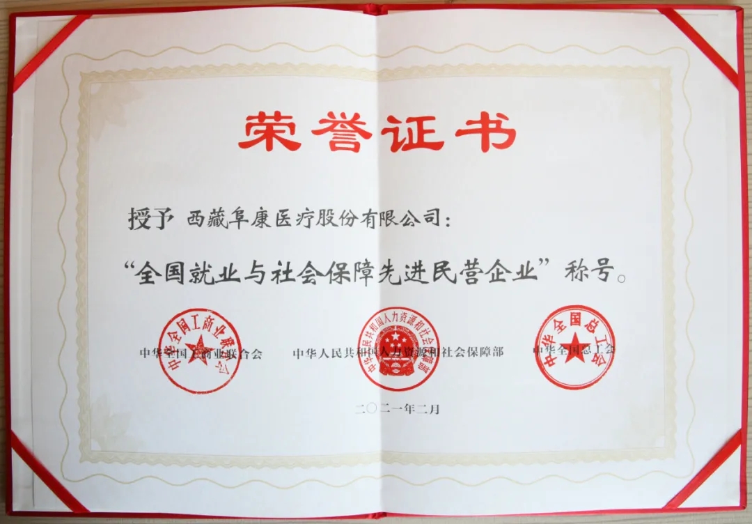 近日,中華全國工商業聯合會、中華人民共和國人力資源和社會保障部、中華全國總工會聯合表彰一批全國就業與社會保障先進民營企業,西藏阜康醫療股份有限公司榜上有名,成為西藏自治區唯一一家獲此殊榮的民營企業。
