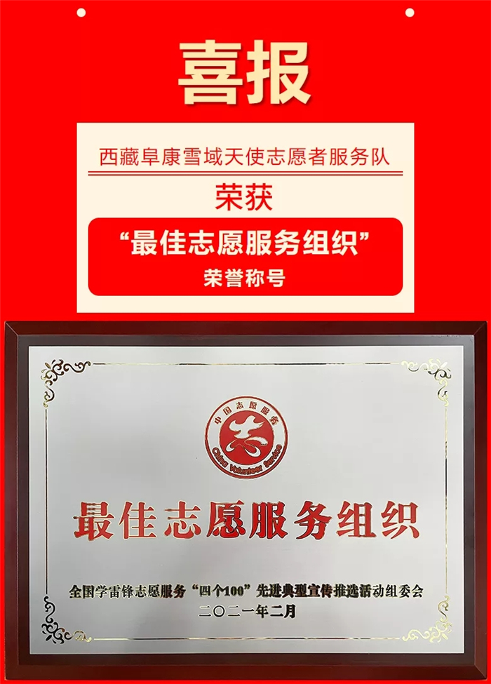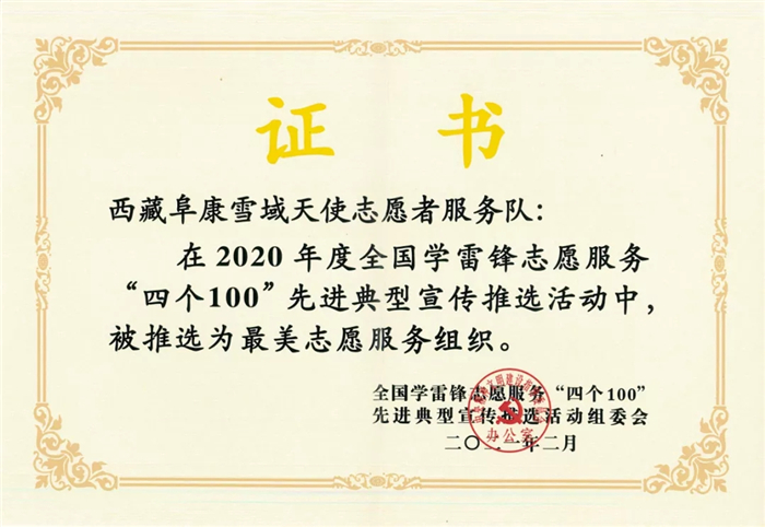 在2020年度全國學雷鋒志愿服務"四個100”先進典型宣傳推選活動中,西藏阜康雪域天使志愿者服務隊榮獲"最佳志愿服務組織”榮譽稱號。