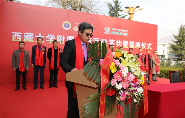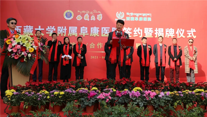 王斌董事長在致辭中說,在黨委、政府的關懷之下,在主管部門的指導之下,在全區人民和社會各界的支持之下,西藏阜康醫院經過十六年的發展,已經成為一家現代化綜合性三級民營醫院。此次西藏大學與西藏阜康醫院的"聯姻”,開啟了地方高校與民營醫院深度合作的先河,西藏阜康醫院成為西藏大學的附屬醫院,體現了西藏大學對阜康醫院的信任,同時也為阜康醫院的發展注入了"強心劑”,雙方的合作一定能實現優勢互補、資源共享、互利雙贏,補齊短板的預期目的。