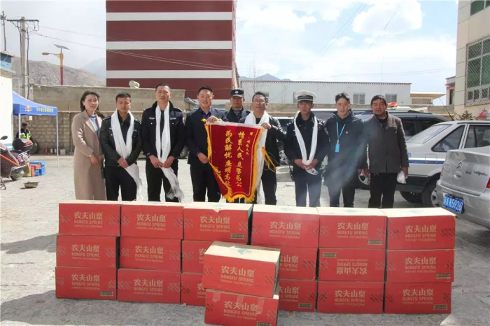 為拉薩市公安局交通警察支隊城北大隊送去(qu)錦旗和20箱礦泉水(shui)